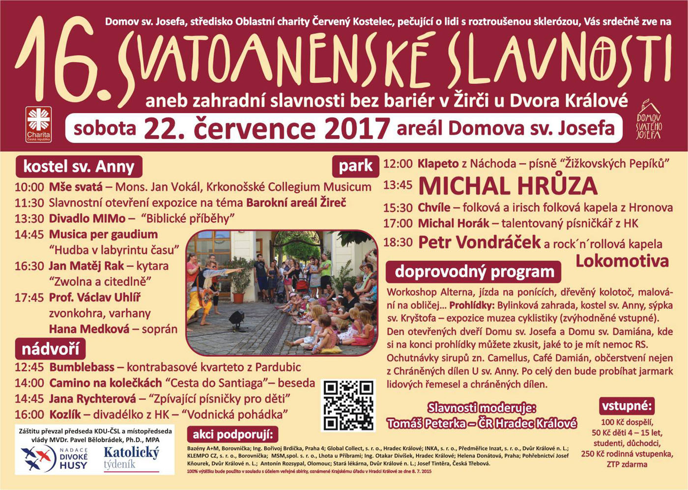 Nenechte si ujít 16. Svatoanenské slavnosti v areálu Domova sv. Josefa v Žirči u Dvora Králové, který je jediným lůžkovým zařízením v ČR, které pečuje o vážně nemocné roztroušenou sklerozou mozkomíšní (RS). Byli jsme tam nedávno na návštěvě s Jakubem a bylo to úžasné setkání. Více informací na http://www.domovsvatehojosefa.cz/svatoanenske-slavnosti/zveme-vas-na-16-svatoanenske-zahradni-slavnosti.html.
